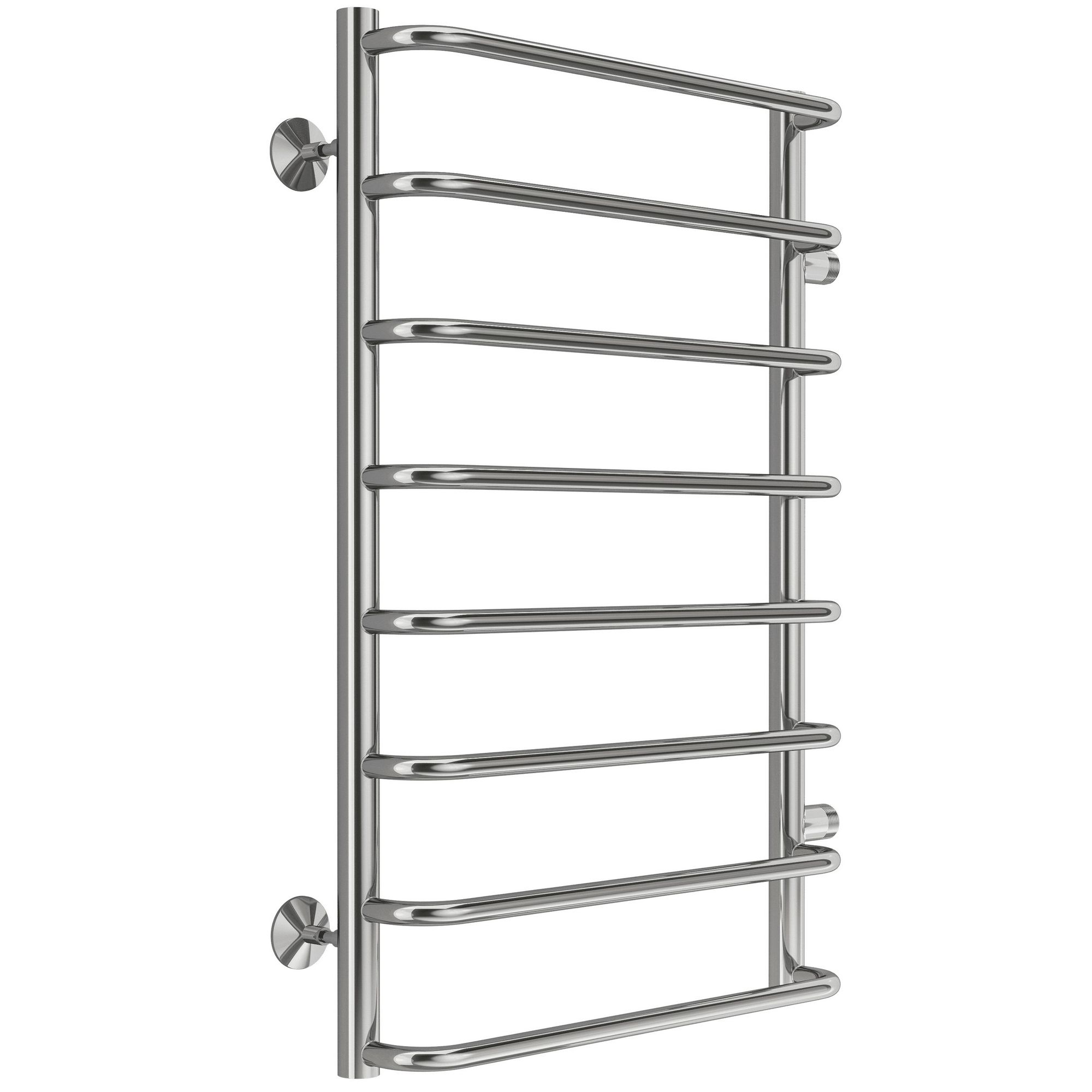 Водяной полотенцесушитель из нержавеющей стали с дугообразными перекладинами. Боковое подключение 1" НР. Комплектация: заглушка под декоративным колпачком - 1 шт, кран Маевского - 1 шт, телескопическое крепление - 4 шт.