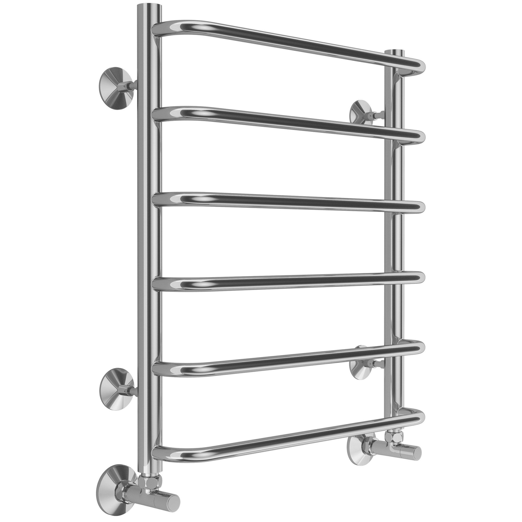 Водяной полотенцесушитель из нержавеющей стали с дугообразными перекладинами. Комплектация: заглушка под декоративным колпачком - 1 шт, кран Маевского - 1 шт, телескопическое крепление - 4 шт.