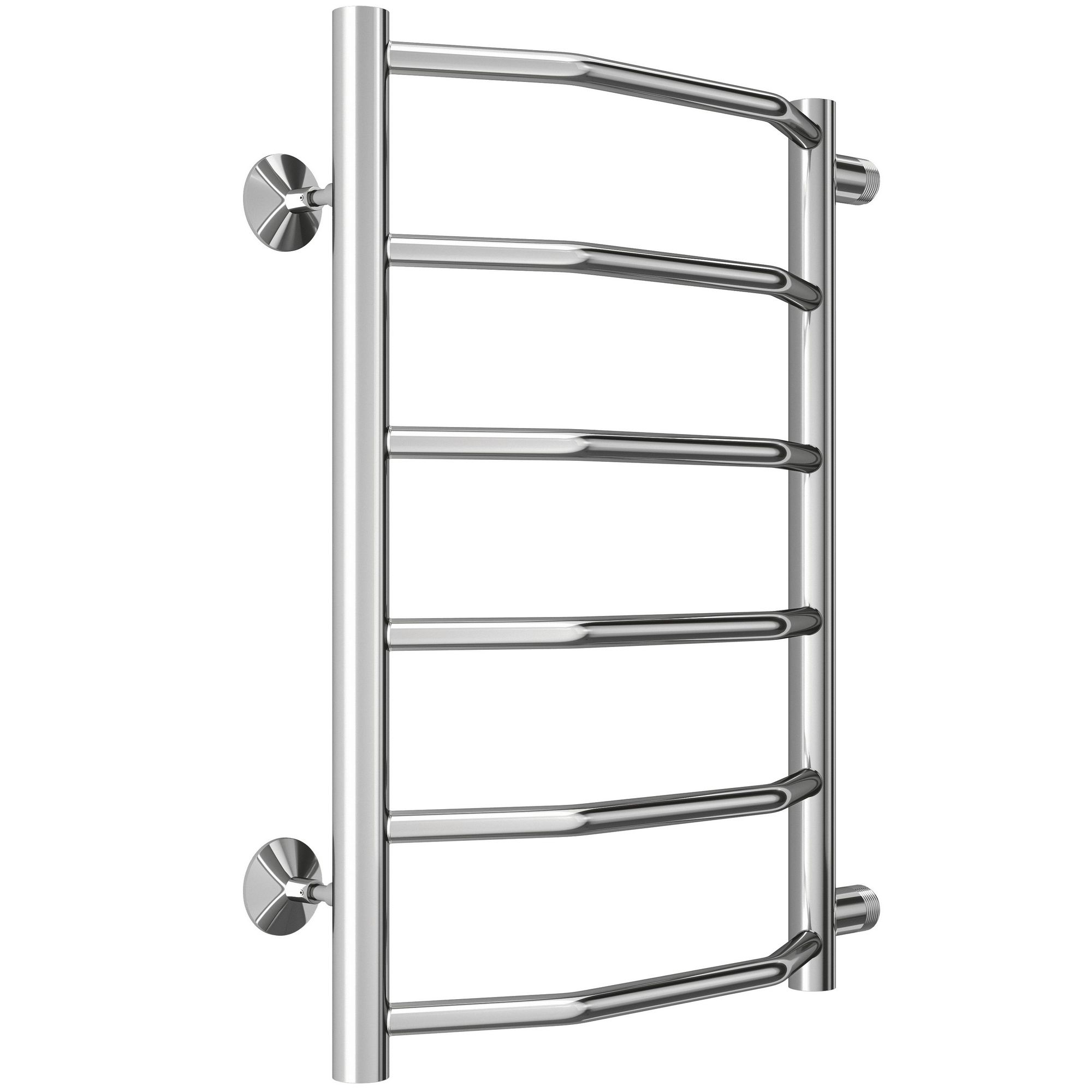 Водяной полотенцесушитель из нержавеющей стали с трапецевидными перекладинами. Боковое подключение 1" НР. Комплектация: заглушка под декоративным колпачком - 1 шт, кран Маевского - 1 шт, телескопическое крепление - 4 шт.