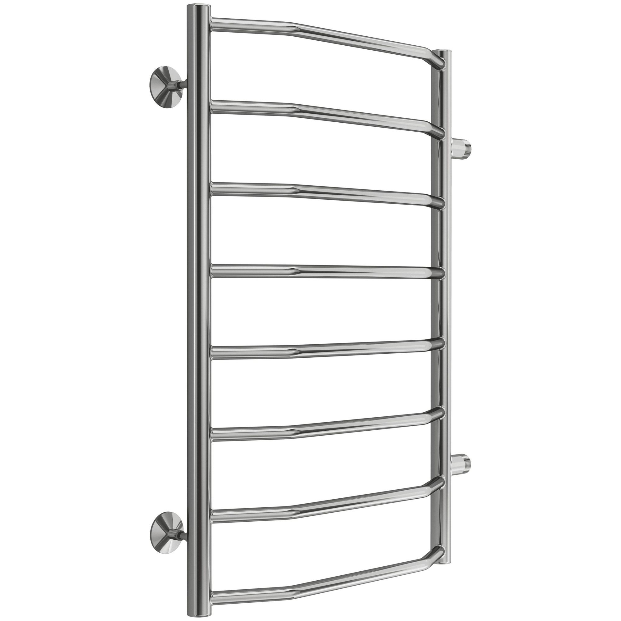 Водяной полотенцесушитель из нержавеющей стали с трапецевидными перекладинами. Боковое подключение 1" НР. Комплектация: заглушка под декоративным колпачком - 1 шт, кран Маевского - 1 шт, телескопическое крепление - 4 шт.