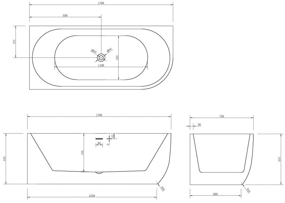 Отдельностоящая акриловая овальная ванна. Возможен пристенный монтаж Длина ванны: 170 см. Ширина ванны: 75 см. Цвет ванны: белый. Слив-перелив в комплекте.
