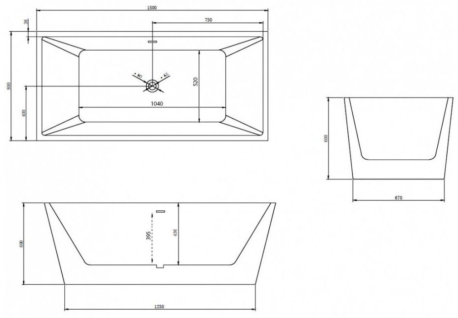 Отдельностоящая акриловая ванна прямоугольной формы в 3 размерах: 150x80, 160x80 и 170x80. Слив-перелив в комплекте.